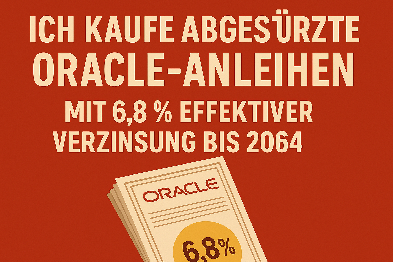 Schönes Wochenende, liebe Börsianer. Ich habe mir letzte Woche einen kleinen Korb von vier Unternehmensanleihen ins Depot gelegt. Unter anderem habe ich bei Oracle-Anleihen (WKN A3L339) zugegriffen und mir eine Effektivverzinsung von 6,8 % für die nächsten 39 Jahre gesichert. Der Nominalzinssatz der Anleihen beträgt 5,5 %. Weil die im September 2024 emittierte Anleihe von … Weiterlesen …