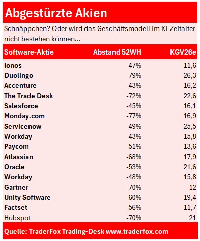 Schönes Wochenende, liebe Börsianer! Nach der Verkaufswelle im amerikanischen Technologiesektor gehe ich auf Schnäppchensuche. Ich hätte vor zwei Jahren nicht gedacht, dass Aktien wie Salesforce wieder mit einem erwarteten KGV von 16 zu haben sein würden. Ich studiere die Tabellen. Die Überbewertungen im Softwaresektor sind verschwunden. Es bleibt die Angst, ob die Geschäftsmodelle im KI-Zeitalter zukunftsfähig sind.