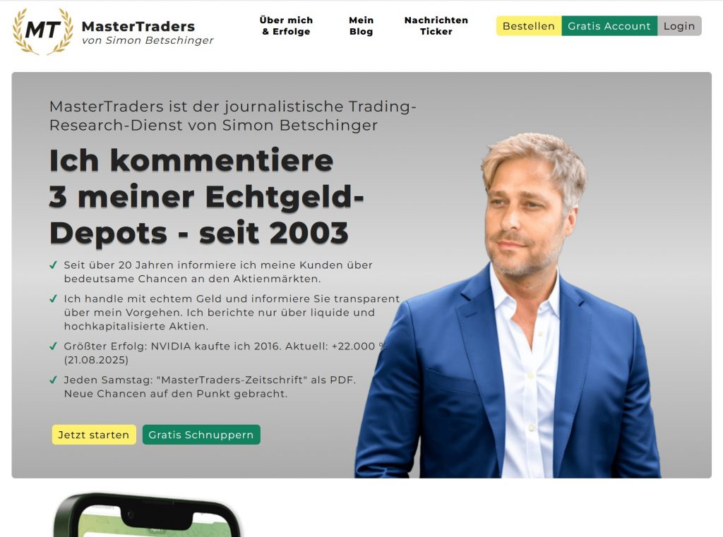 MasterTraders hat mittlerweile Legendenstatus erreicht. Es handelt sich um meinen journalistischen Trading-Research-Dienst, den ich 2003 startete. Seit über 20 Jahren kommentiere ich Echtgeld-Depots vor mir. Mein größter Erfolg ist NVIDIA mit derzeit +22.000 %. Ich schreibe unheimlich gerne über die Börse und mag es, darüber nachzudenken, welche Firmen von neuen Technologien profitieren.