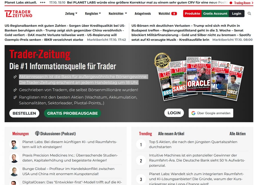 Die Trader-Zeitung ist eine täglich erscheinende, digitale Zeitung, die ausschließlich über Börse und Aktien berichtet. Das Preis beträgt 29 € pro Monat. Wir starteten das Projekt im März 2023. Mitterweile haben über 3000 Abonennten die Trader-Zeitung abonniert. Mein nächstes Ziel ist es, die Abozahlen auf über 10.000 zu steigern. Bei diesem Projekt gibt es derzeit zwei bedeutsame unternehmerische Stoßrichtungen: