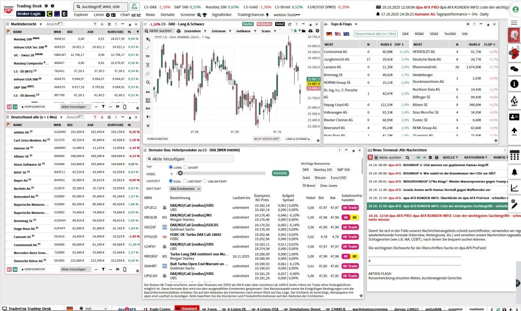 Unter wichtigstes Produkt ist das TraderFox Trading-Desk. Es handelt sich um ein professionelles Trading-Terminal, das komplett im Browser läuft. Das Trading-Desk bietet kostenlose Realtimekurse zu derzeit etwa 12.000 Aktien und Märkten. Über 100.000 registrierte Nutzer verwenden unser Trading-Desk für Charting, Echtzeitkurse, Signale, Alarme, Nachrichten, Aktien-Scans oder um fundamentale Informationen anzuzeigen.