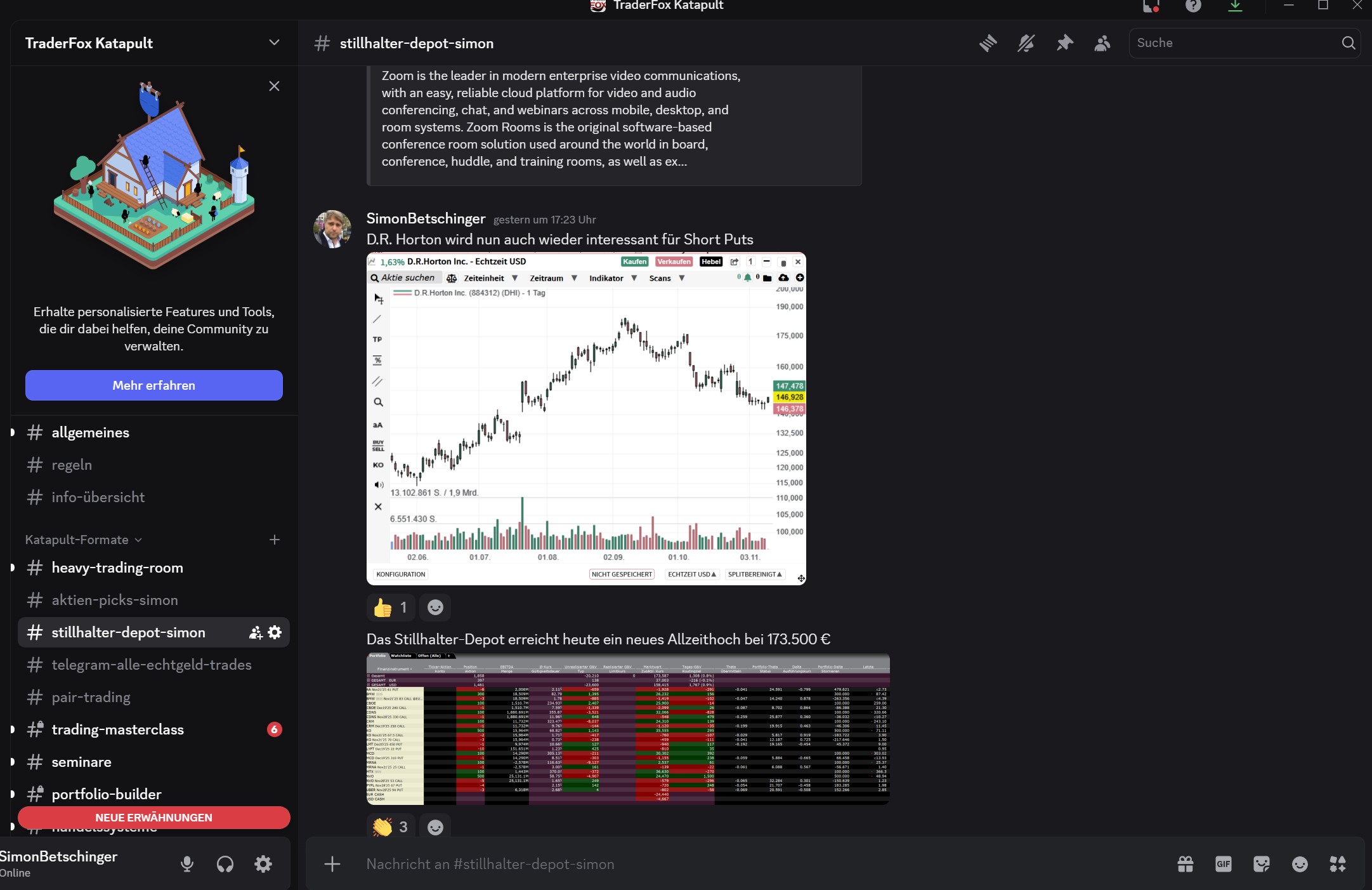 TraderFox Katapult heißt der Trader-Club von TraderFox. Über einen moderierten Discord-Server können sich Trader untereinander austauschen. Ich halte dort jeden Freitag um 12:30 Uhr eine halbstündige Trading-Masterclass über Zoom und berichte über neue Chancen an den Aktienmärkten. Ein Trading-Projekt, das sehr anspruchsvoll ist und das mich deswegen auch sehr begeistert, ist mein Stillhalter-Depot. Ich führe bei TraderFox Kapault eine sehr offensive Variante der Optionsstrategie „The Wheel“ aus. Ich schreibe Short Puts auf Aktien und kassiere die Prämien. Wenn ich angedient werde, schreibe ich Covered Calls. Jede Transaktion teile ich in dem entsprechenden Kanal auf Discord.